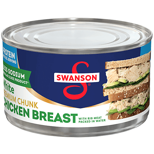 Enjoy a delicious shortcut to your favorite chicken dishes with Swanson® 25% Less Sodium White Premium Chunk Canned Chicken Breast in Water. Living up to Swanson’s tradition of simple ingredients, our ready-to-eat, fully cooked chicken chunks contain no antibiotics, added MSG or artificial flavors. With 250 mg of sodium per serving, this premium white chicken meat has 25% less sodium than a 12.5-ounce can of our regular white meat, which contains 340 mg of sodium per serving. It’s also 98% fat free, gluten free and an excellent source of protein, with 15 grams in each 3-ounce serving. Eat it on crackers, add it to salads, or use it in any recipe that calls for diced chicken breast. It’s perfect for making homemade buffalo chicken dip, chicken salad, chicken quesadillas, chicken alfredo and more. Each 12.5-ounce can contains 3-ounce servings of fully cooked chicken breast chunks. Create quick and easy everyday meals and sides with Swanson® 25% Less Sodium White Premium Chunk Chicken in a Can.